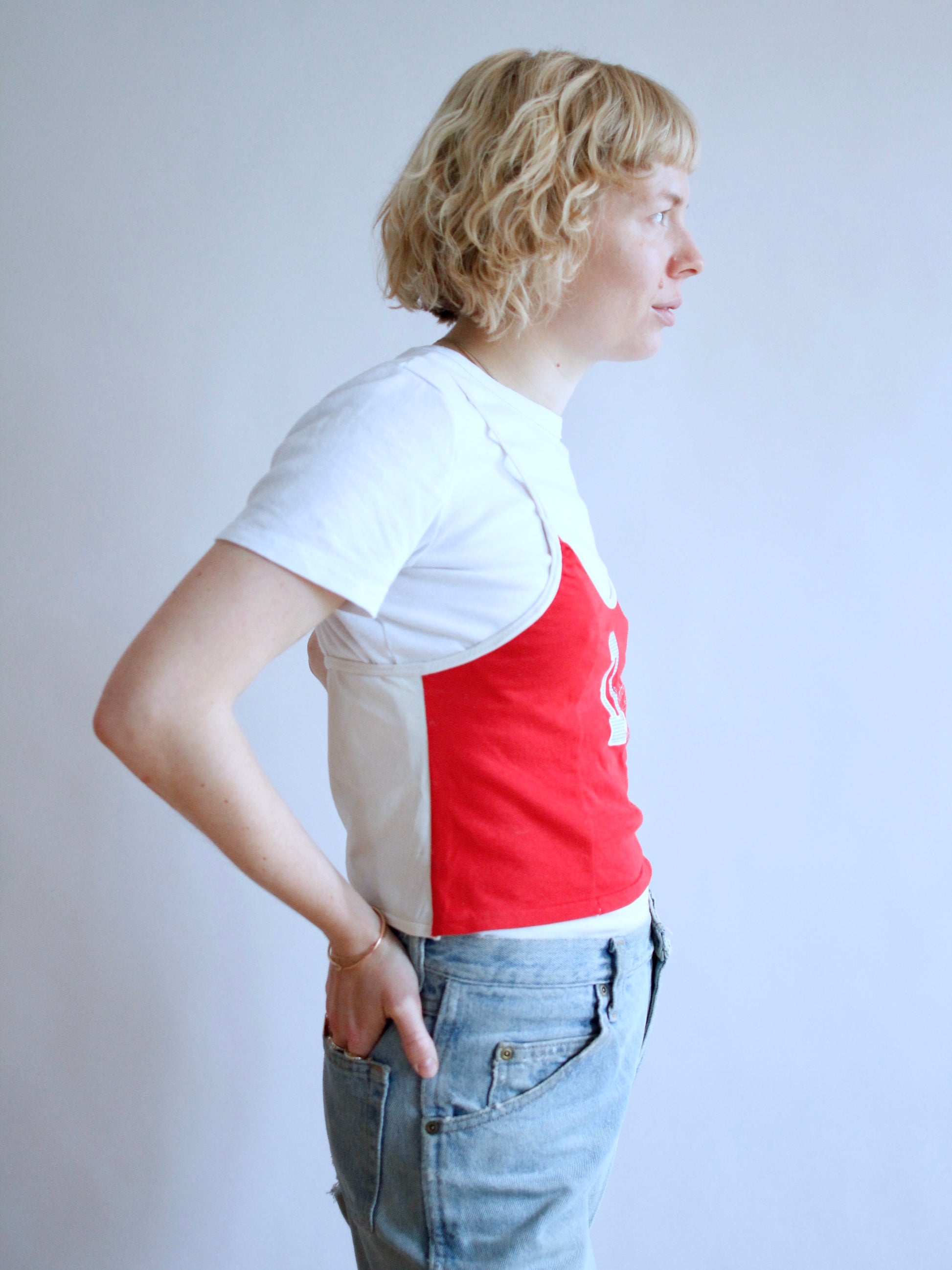 Front is made from red cotton jersey with a print, the back is crafted from an off-white swimwear-like material.